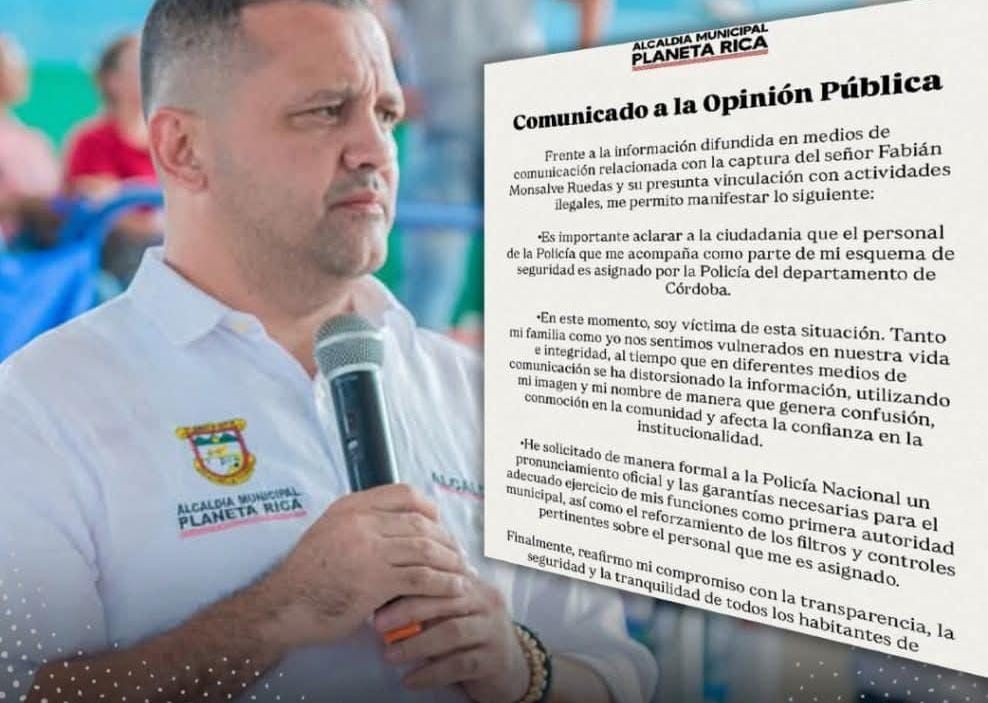 Alcalde de Planeta Rica se pronuncia tras captura de un miembro de su esquema de seguridad por presuntos vínculos con el Clan del Golfo.