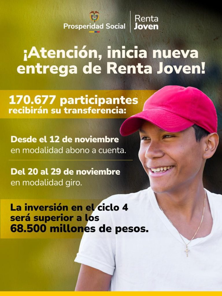 La entidad reitera el llamado a los participantes de Renta Joven para que gestionen antes del 17 de noviembre sus novedades, que aplicarán para el ciclo 5 de 2025. Pueden hacerlo a través del Portal del Joven: https://jovenes.prosperidadsocial.gov.co/RentaJoven.