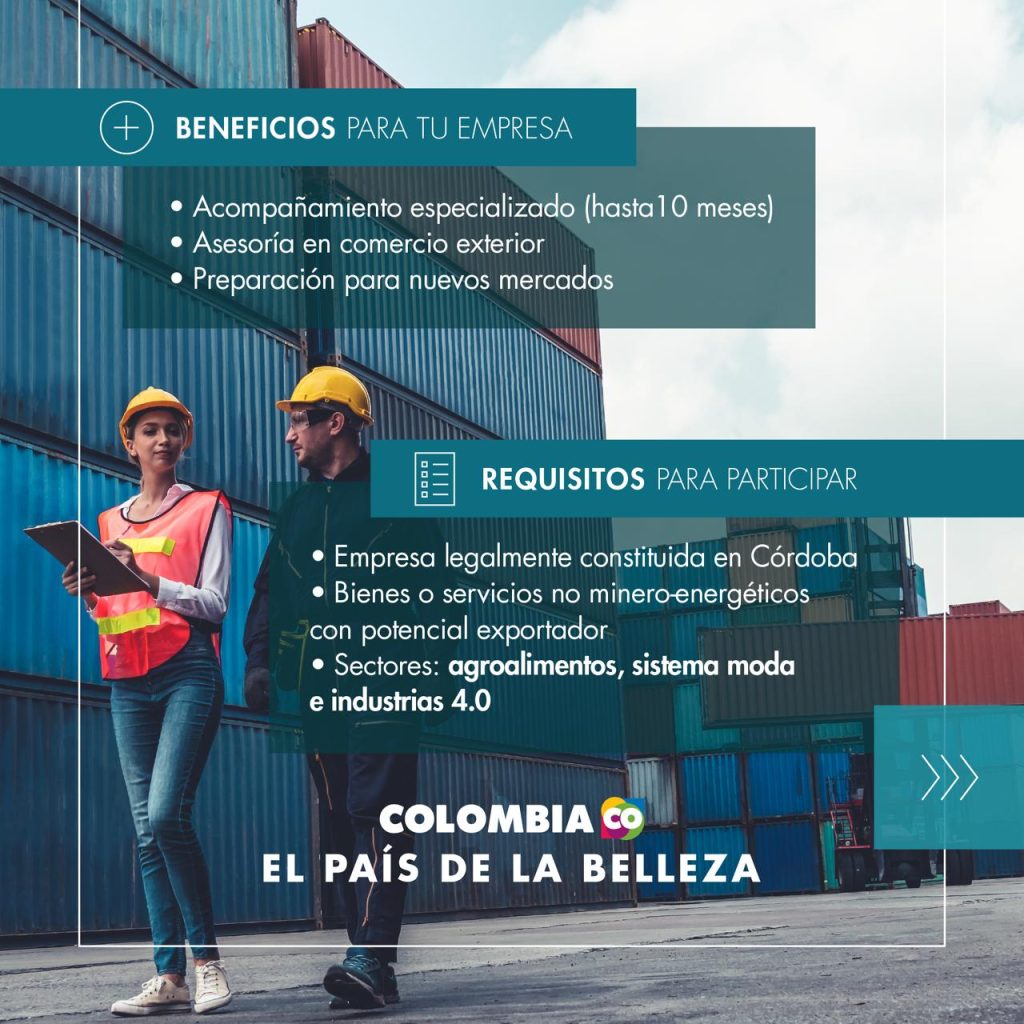 Desde hoy 9 y hasta el 23 de enero de 2026, estará abierta la convocatoria dirigida a organizaciones que desean competir en el mercado internacional; deben ser empresas legalmente constituidas en Córdoba que ofrezcan bienes o servicios no minero-energéticos y pertenezcan a los sectores de agroalimentos, sistema moda e industrias 4.0.