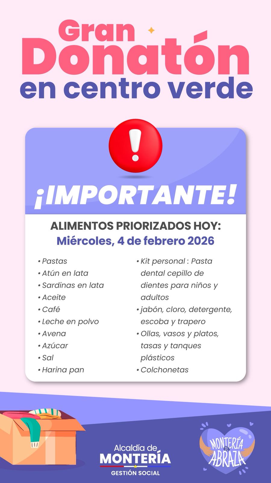 La Alcaldía de Montería, a través de la Oficina de Gestión Social, informó a la ciudadanía los elementos priorizados para la jornada de hoy miércoles 4 de febrero en el marco de la Gran Donatón que se desarrolla en el Centro Verde, con el propósito de atender a las familias afectadas por las inundaciones en distintos sectores del municipio.
