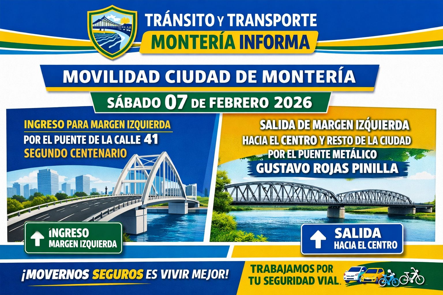 En sentido contrario operará el Puente Segundo Centenario de Montería, que permitirá el paso exclusivo desde la margen derecha hacia la margen izquierda.